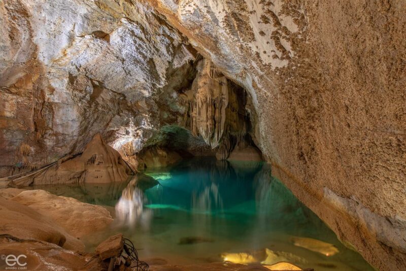 Ici, l’eau est la grande architecte. Elle a sculpté des paysages souterrains magnifiques, formant de majestueuses draperies minérales. Le point d’orgue de la visite est le Lac de Minuit : ce bassin d’eau pure, aux reflets émeraude et bleu nuit, offre un miroir parfait où la roche semble flotter.